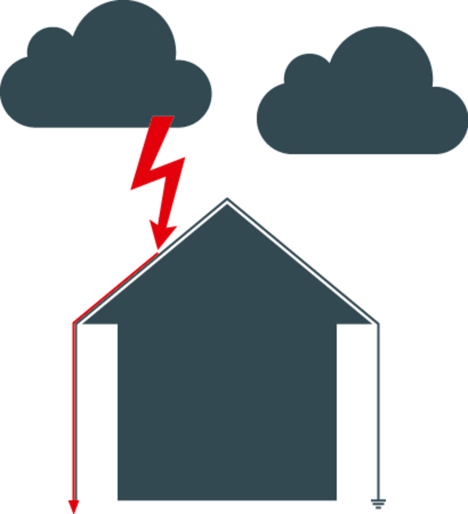 Der äußere Blitzschutz fängt den Blitz mit einer Fangeinrichtung ein, leitet ihn sicher ab und verteilt ihn über die Erdungsanlage ins Erdreich. Damit bildet er eine schützende Hülle um das Gebäude.