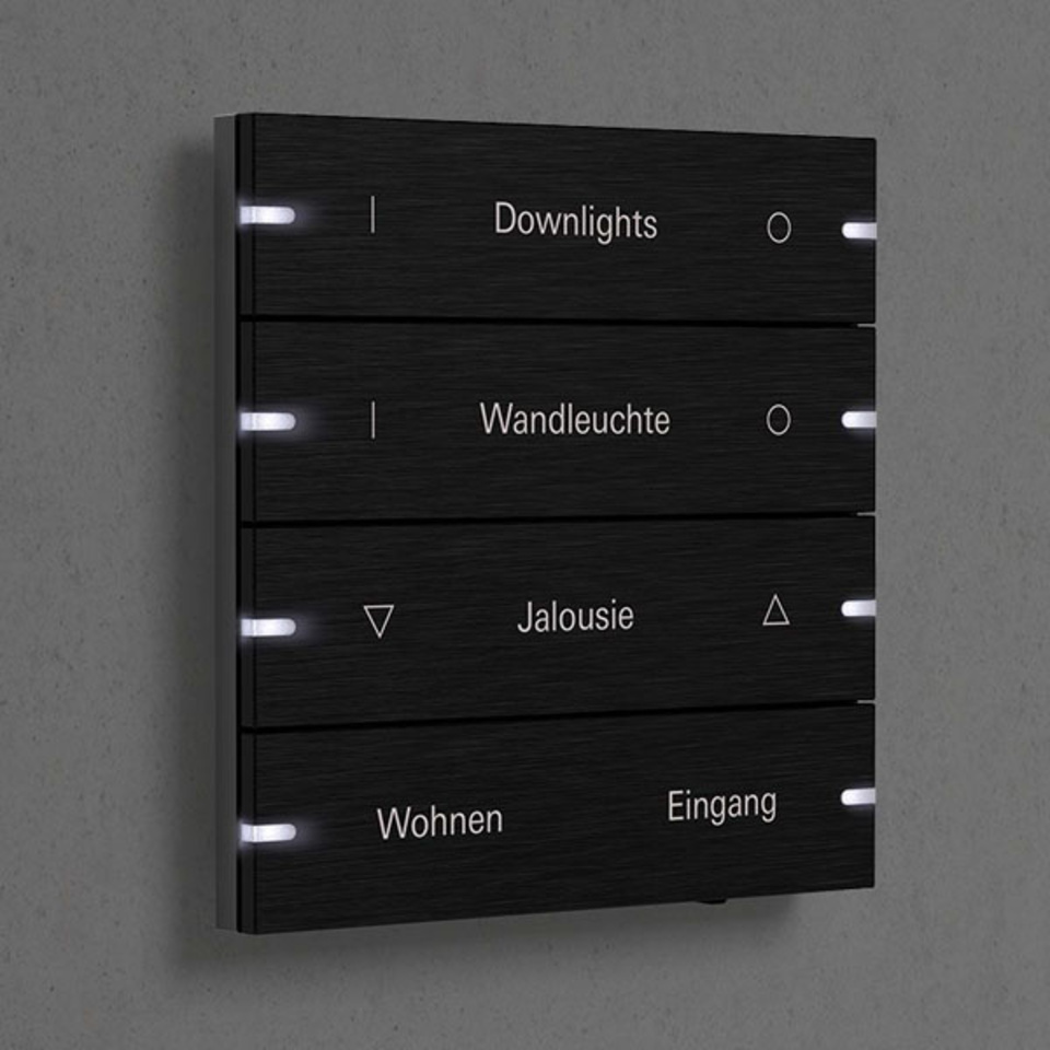 Der Gira Tastsensor 4 vereint edles Design mit großem Funktionsumfang unter einer minimalistischen Oberfläche. Bis zu acht individuelle Funktionen können im Tastsensor 4 belegt und in ein KNX-System eigebunden werden. So können Sie beispielsweise Jalousie und Beleuchtung bequem über eine Bedieneinheit steuern. Für eine intuitive Bedienung sorgt dabei spürbares Feedback der Tasten.