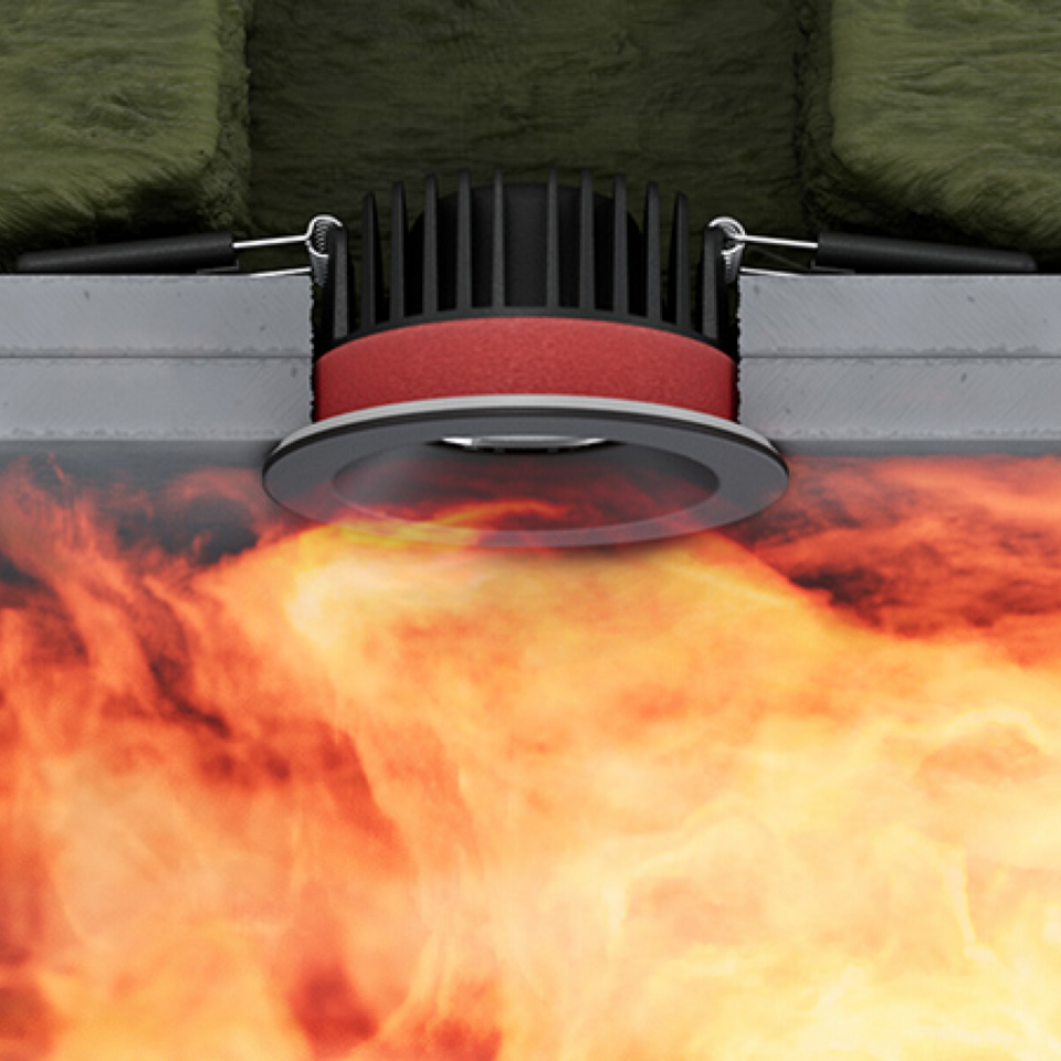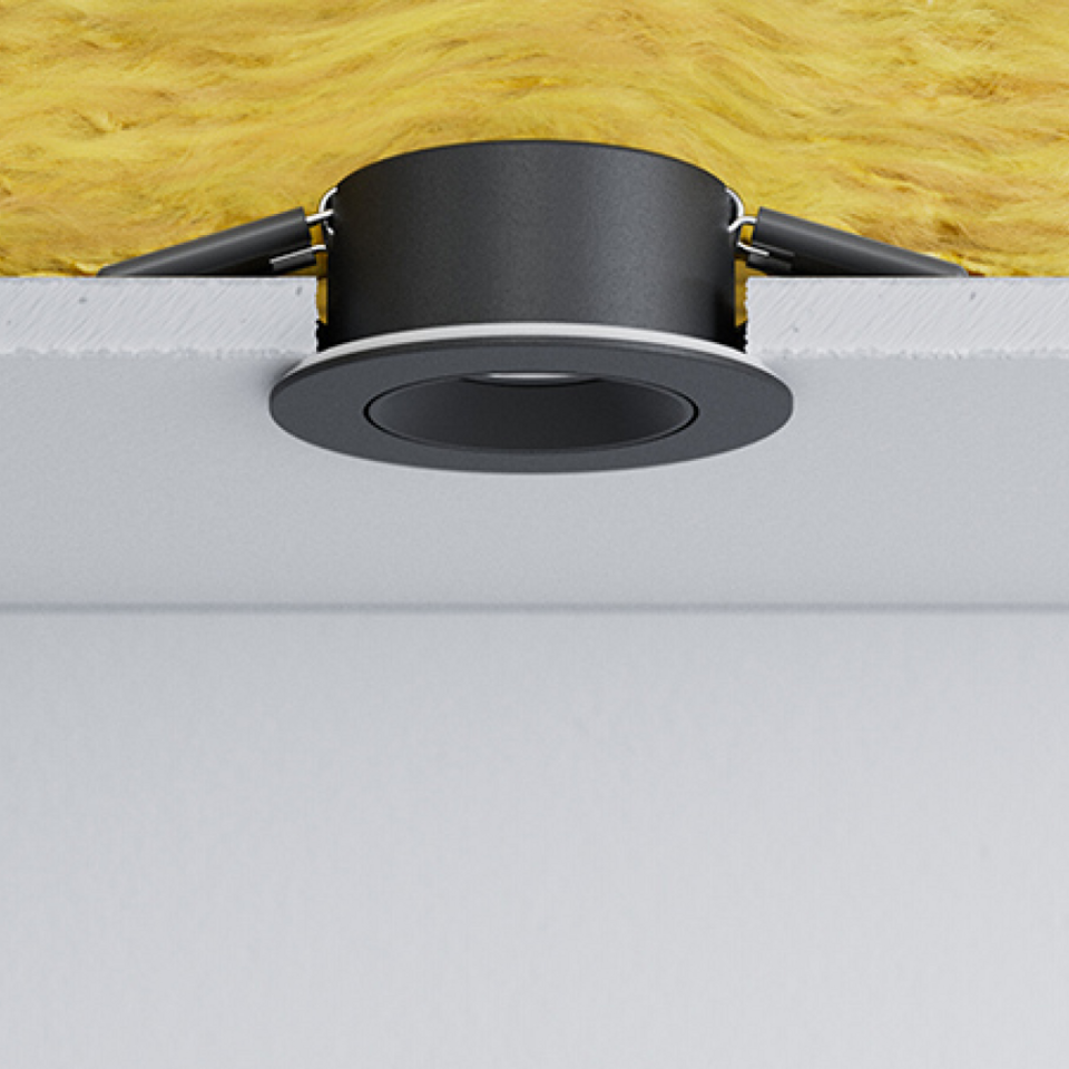Der SPOT FIRE RATED von LEDVANCE stellt sicher, dass die Funktionalität der Branddecke auch nach dem Einbau für bestimmte Deckensysteme und Brände gewährleistet ist.